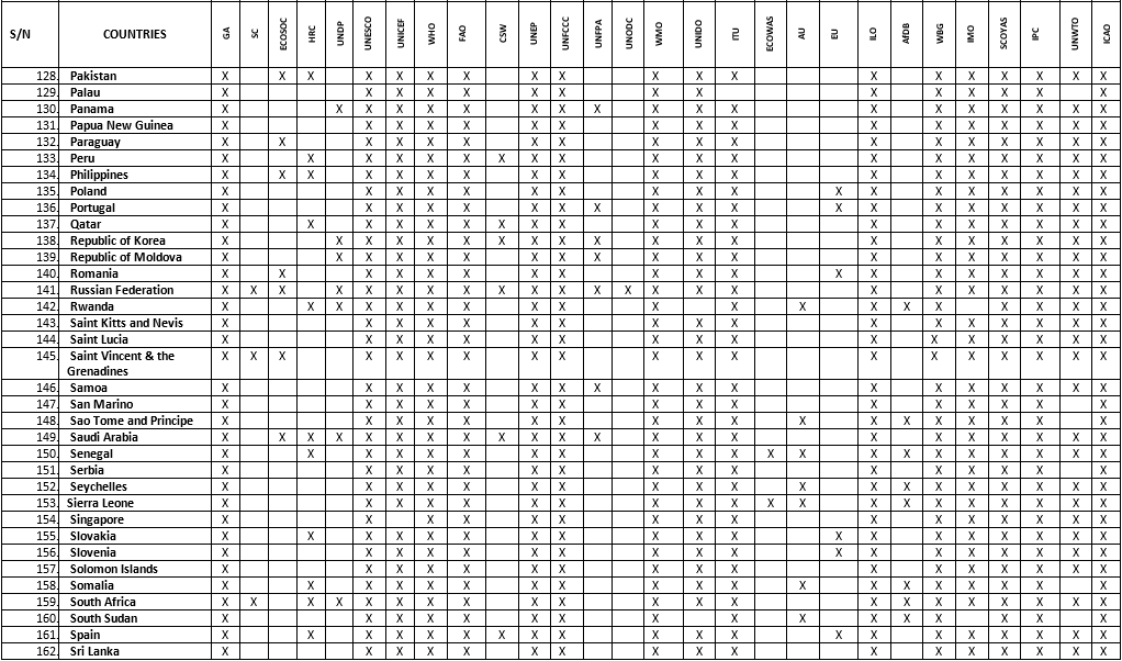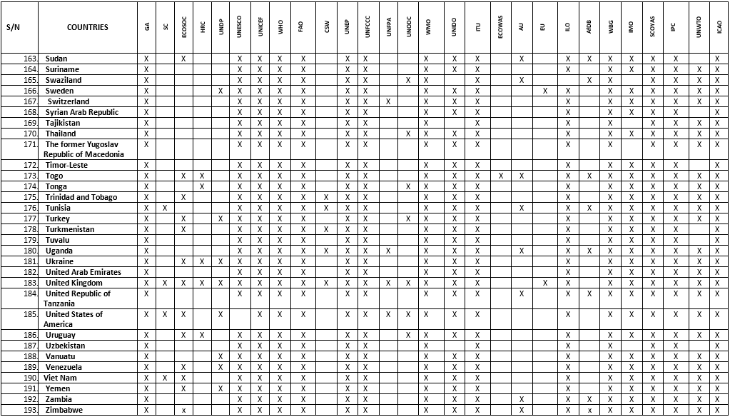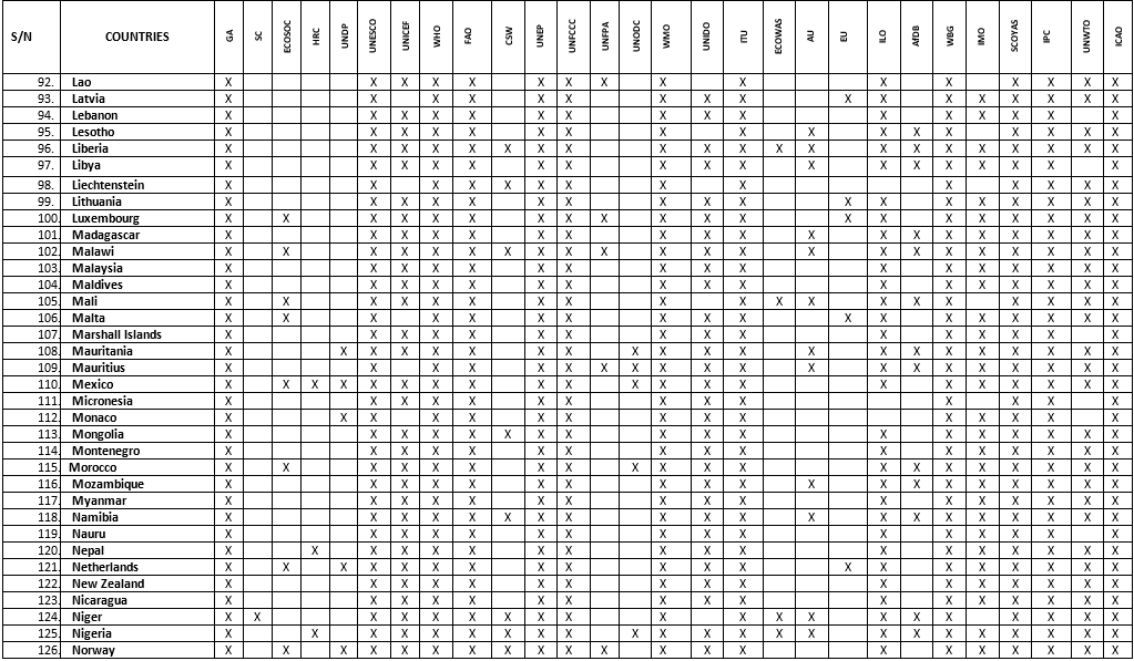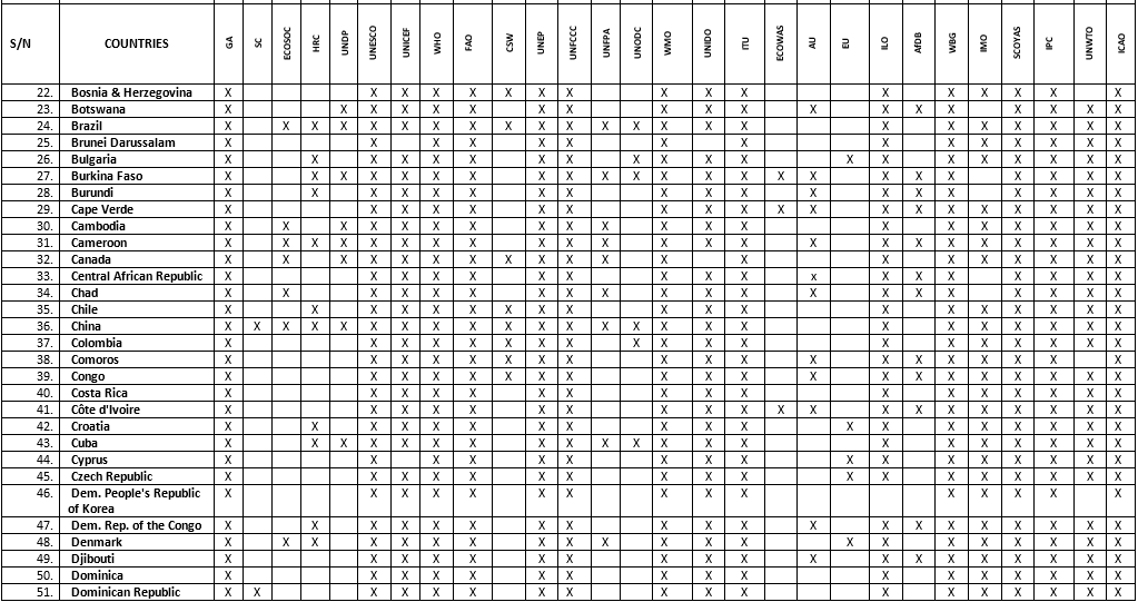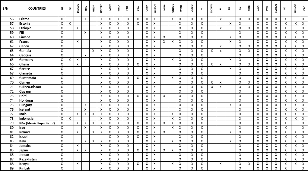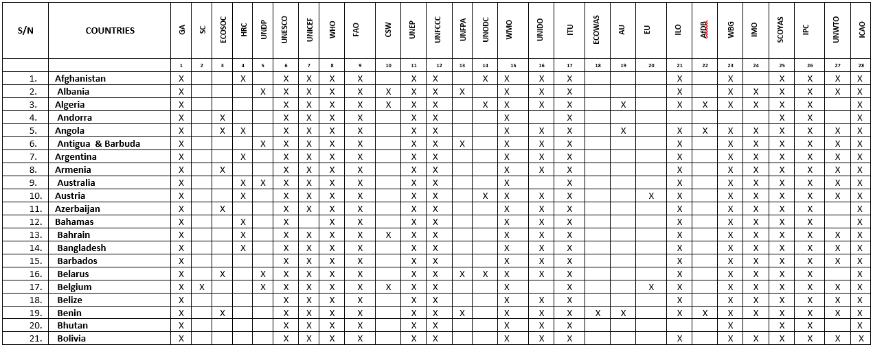 Committees: 1) General Assembly (GA), 2) Security Council (SC), 3) Economic and Social Council (ECOSOC), 4) Human Rights Council (HRC), 5) United Nations Development Programme (UNDP), 6) United Nations Educational, Scientific and Cultural Organization (UNESCO), 7) United Nations Children Fund (UNICEF), 8) World Health Organization (WHO), 9) Food and Agricultural Organization (FAO), 10) Commission On the Status of Women (CSW), 11) United Nations Environment Programme (UNEP), 12) United Nations Framework Convention on Climate Change (UNFCCC), 13) United Nations Fund for Populations Activities (UNFPA), 14) United Nations Office On Drugs and Crime (UNODC), 15) World Meteorological Organization (WMO), 16) United Nations Industrial Development Organization (UNIDO), 17) International Telecommunication Union (ITU), 18) Economic Community of West African States (ECOWAS), 19) African Union (AU), 20) European Union (EU), 21) International Labour Organization (ILO), 22) African Development Bank (AfDB), 23) World Bank Group (WBG), 24) International Maritime Organization (IMO), 25) Special Youth Committee On Youth Action on the SDGs (SCOYAS), 26) International Press Committee (IPC), 27) United Nations World Tourism Organization (UNWTO), 28) International Civil Aviation Organization (ICAO),